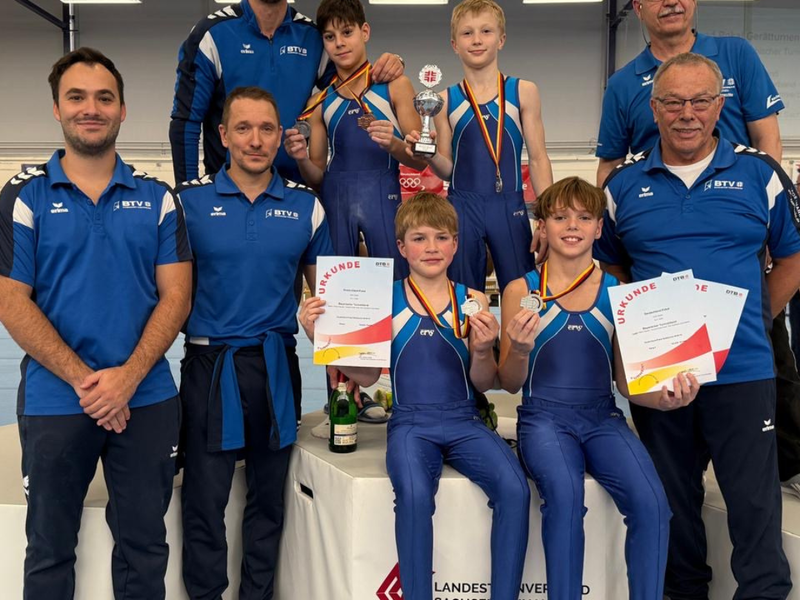 Auch die Mannschaft der Altersklasse 11–12 zeigte einen tollen Wettkampf und sammelte wertvolle Erfahrungen. Für den BTV gingen Philipp Dörner (Platz 14 mit 50,475 Punkten), Samuel Weichelt, Moritz Heller und Luis Bolsinger an den Start. Alle vier turnten engagiert und lieferten ein solides Mannschaftsergebnis. Für viele war es der erste große nationale Vergleich – eine starke Leistung, auf der sich aufbauen lässt.